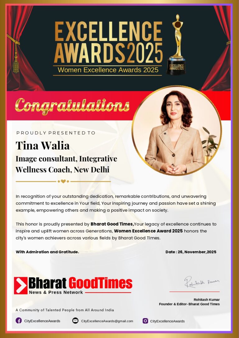 Tina Walia has been honored with the prestigious Women Excellence Award 2025 by Bharat Good Times. This award recognizes her remarkable dedication, influential contributions, and unwavering commitment to excellence as an Image Consultant and Integrative Wellness Coach. Her inspiring journey continues to uplift and empower women across generations.